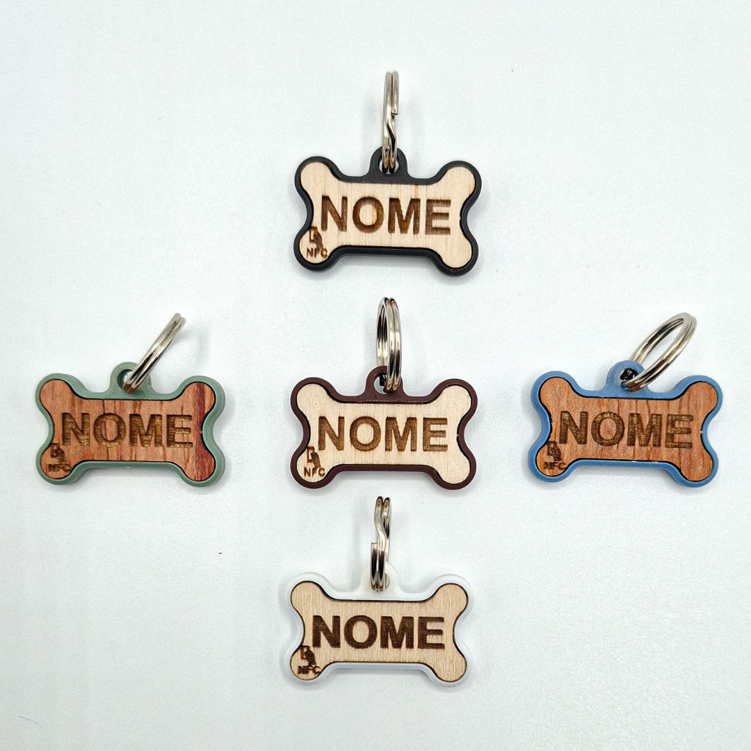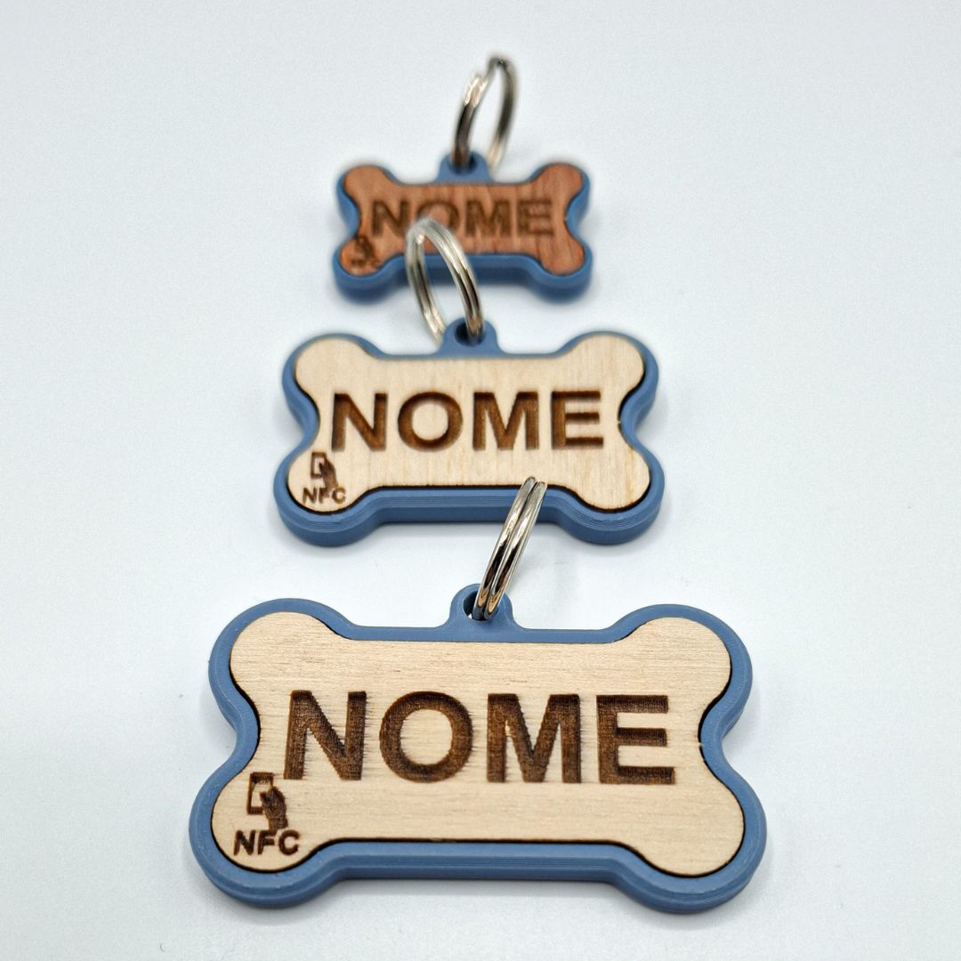 Ogni medaglietta è realizzata in stampa 3D con inserto in legno naturale chiaro o scuro, e viene incisa a laser con il nome del tuo cane.